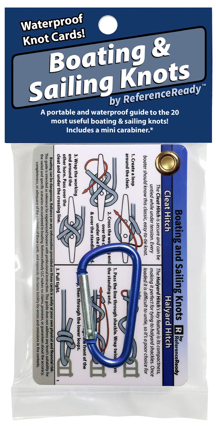 A portable, waterproof boating knot guide in a 5-card format slightly larger than credit card size. Contains diagrams for 20 essential boating and sailing knots with descriptions and usage tips. A waterproof and durable alternative to paper books or smartphones that clips right to your boat bag.