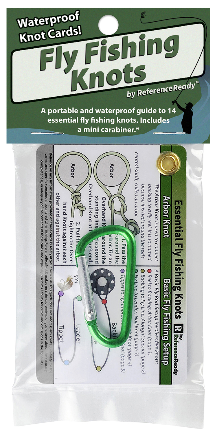 A waterproof, credit card-sized portable knot instruction guide showing how to tie 14 fly fishing knots with simple diagrams, usage tips, and a basic fly fishing setup diagram. Printed on ultra-durable plastic that is totally waterproof and super tough. Includes a mini carabiner to clip to your vest or pack.